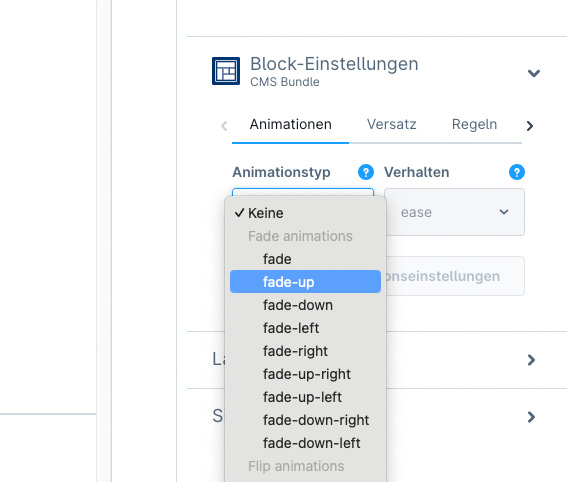 CMS-Elemente können mit verschiedenen Animationen versehen werden. Z.B. Fade, Zoom etc.