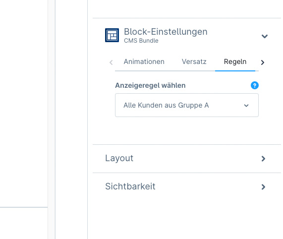 Zusätzlich können Sie Elemente und Sections in Abhängigkeit von Rules darstellen. Z.B. nur die Kundengruppe "Händler" soll einen Bereich angezeigt bekommen. Die Regeln sind individuell definierbar.