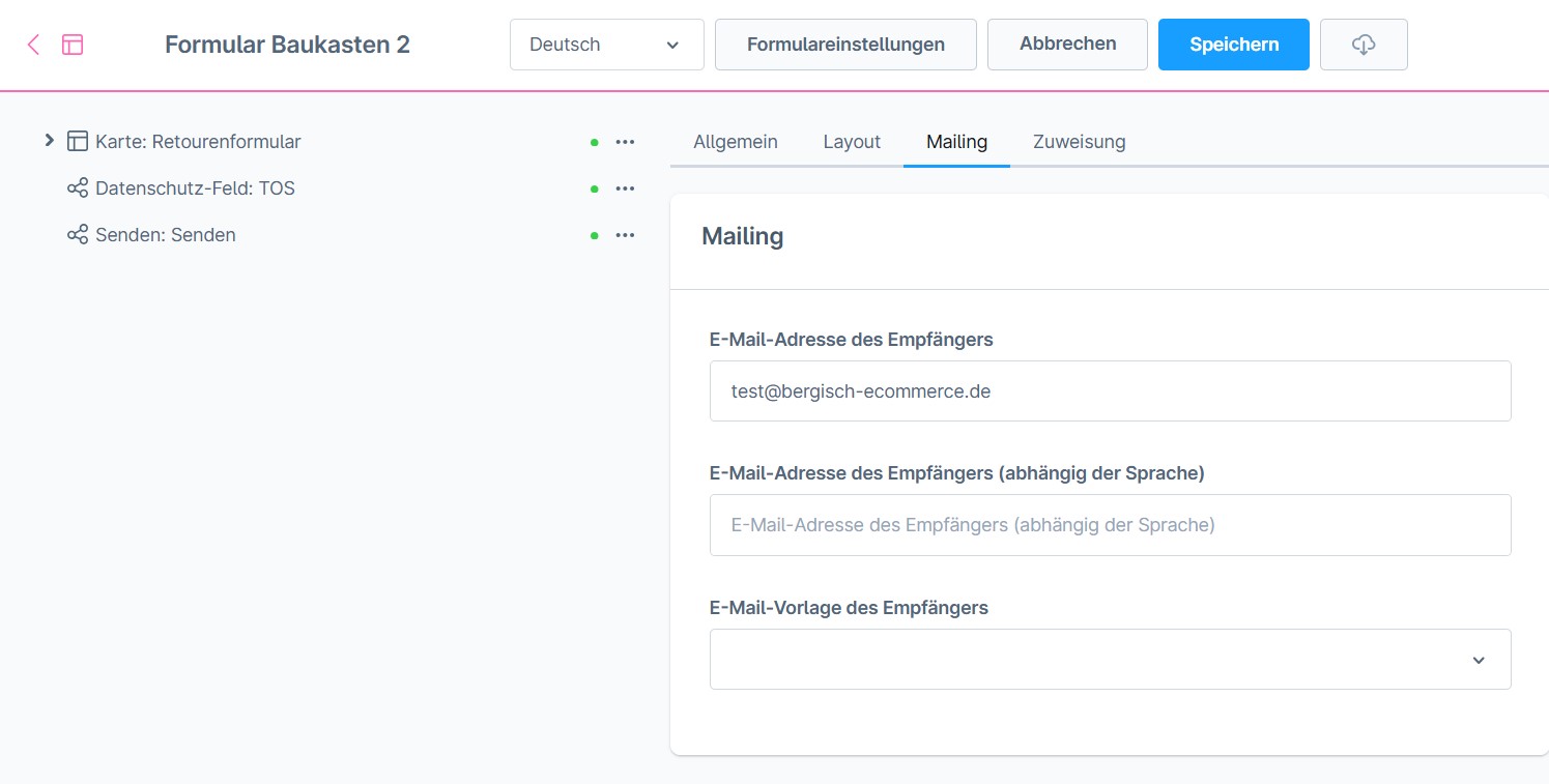 In diesem Bereich kann man den E-Mail-Empfänger individuell festlegen. Falls kein Wert eingetragen wird, nutzt das System automatisch die Standard-E-Mail-Adresse des Shops. Des Weiteren können hier komplexe Formulare erstellt werden, die auch für eine Umfrage dienen können.