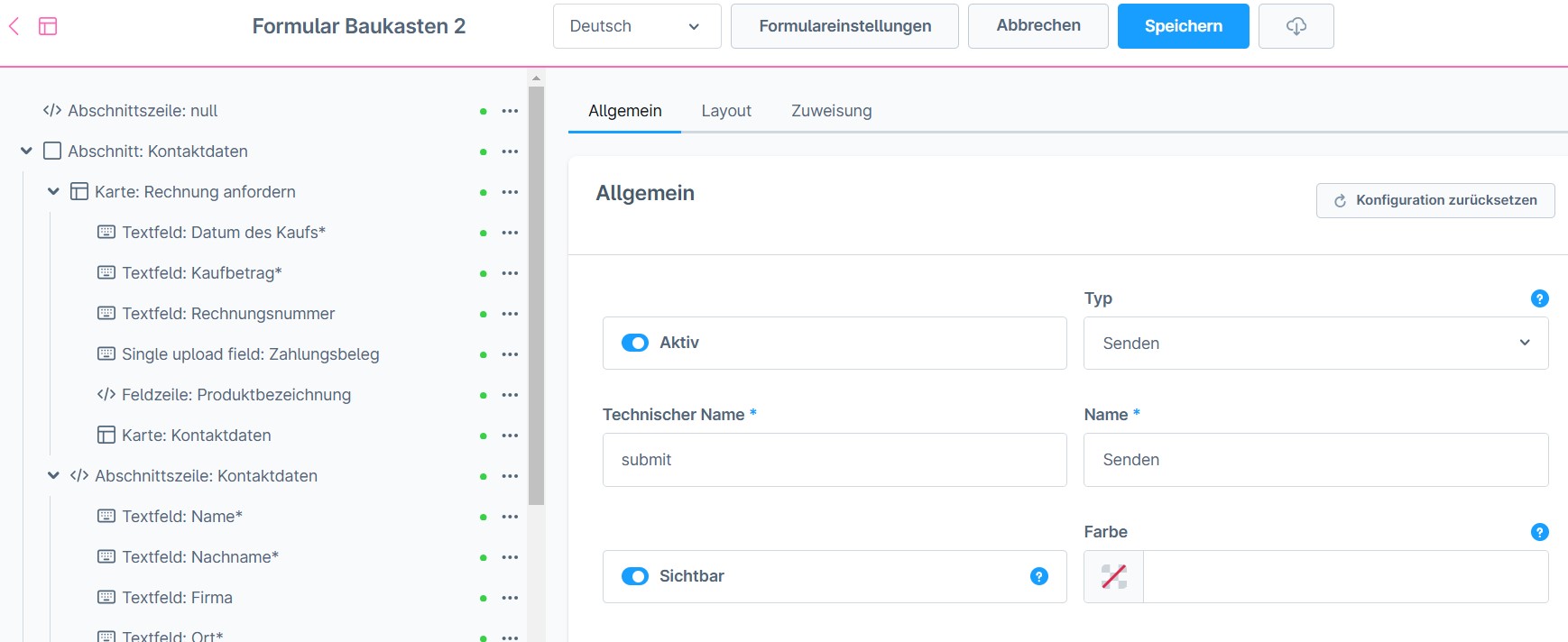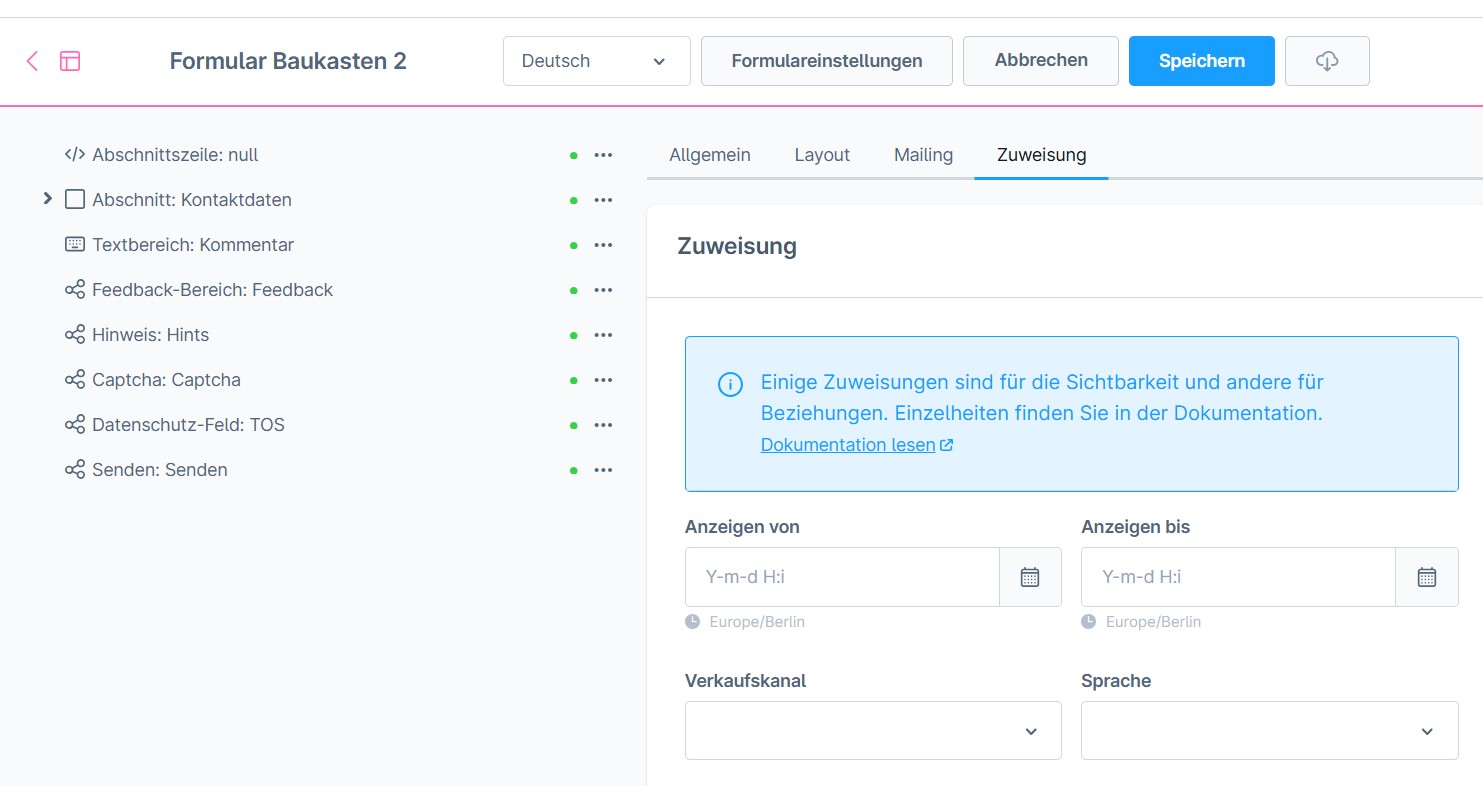 Es besteht die Möglichkeit, die Sichtbarkeit der Formulare zu konfigurieren. So können Formulare in einem bestimmten Zeitraum, einem bestimmten Verkaufskanal, einem ausgewählten Lieferland, einer Versand oder Zahlungsart oder einer Kundengruppe zugewiesen werden.