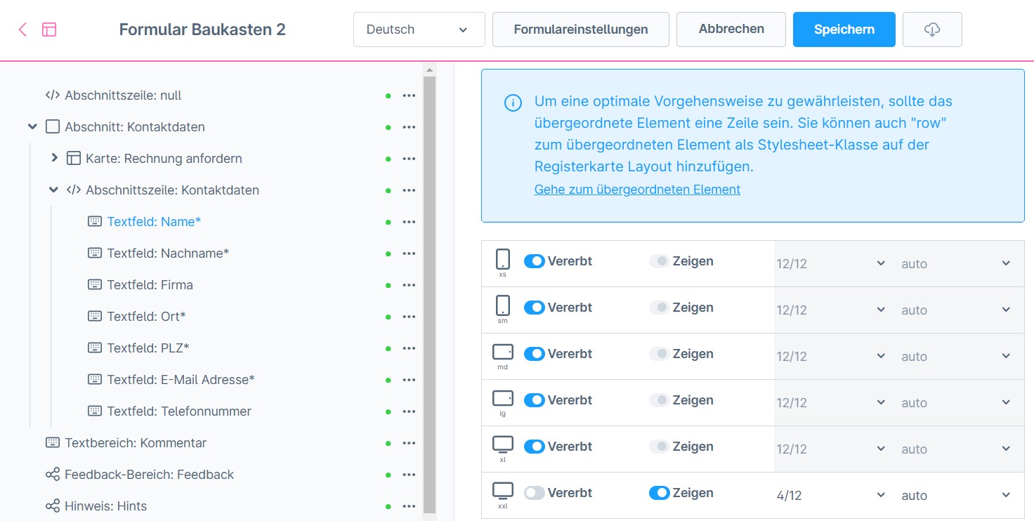 Sofern das Eltern-Element zur Gruppe „Zeilen/Rows“ gehört, können alle darin enthaltenen Elemente responsive Eigenschaften erhalten. Dabei gilt das „Mobile-First“-Prinzip, wodurch Eigenschaften stets an größere Viewports vererbt werden. Diese Struktur ermöglicht eine flexible Anpassung des Layouts an verschiedene Bildschirmgrößen und sorgt für eine optimale Darstellung auf allen Endgeräten.