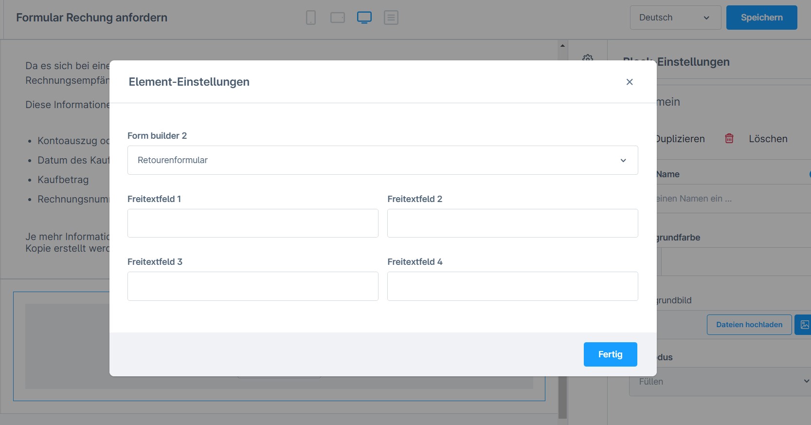 Das Formular besitzt keinen eigenen Block, sondern ist über das „Element Austauschen“-Symbol zugänglich. Sobald das CMS-Element eingefügt wurde, können Formulare vom Typ CMS oder Test der jeweiligen CMS-Seite zugewiesen werden.