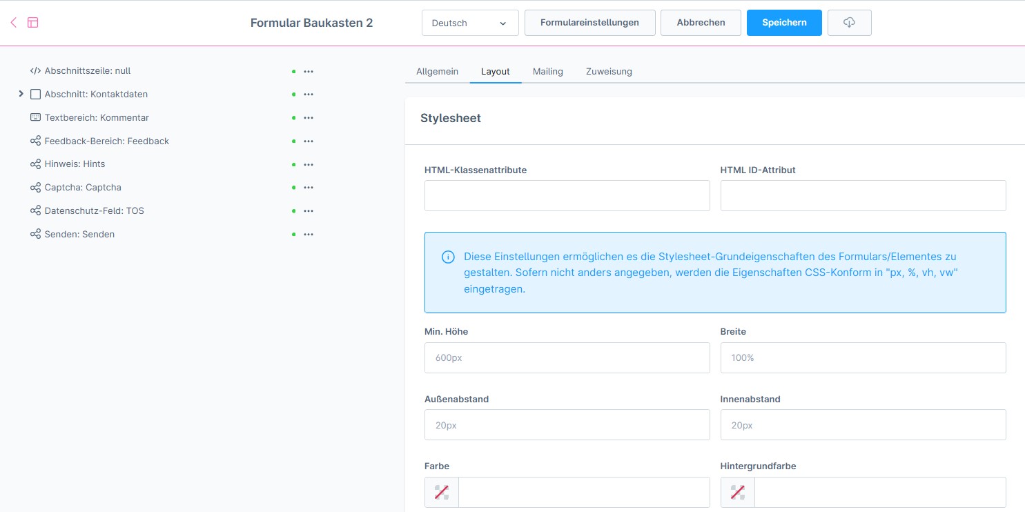 Jedes Formular oder Element können individuelle Stylesheet-Attribute zugewiesen werden, um das Erscheinungsbild optimal an deine Anforderungen anzupassen. Dabei stehen dir je nach Formular- oder Elementtyp unterschiedliche CSS-Optionen zur Verfügung, mit denen man beispielsweise Farben, Abstände und Schriftarten gezielt steuern kann.